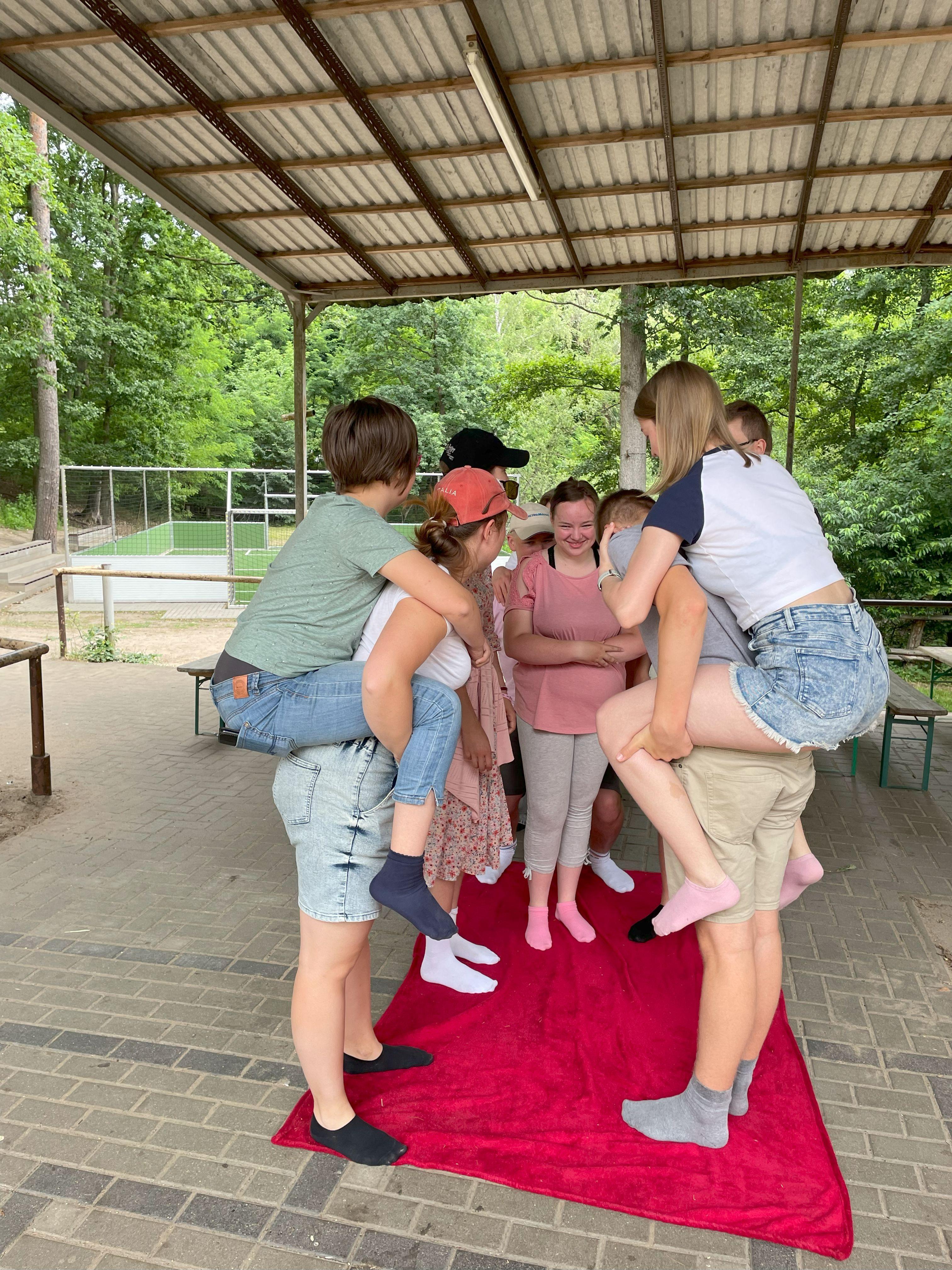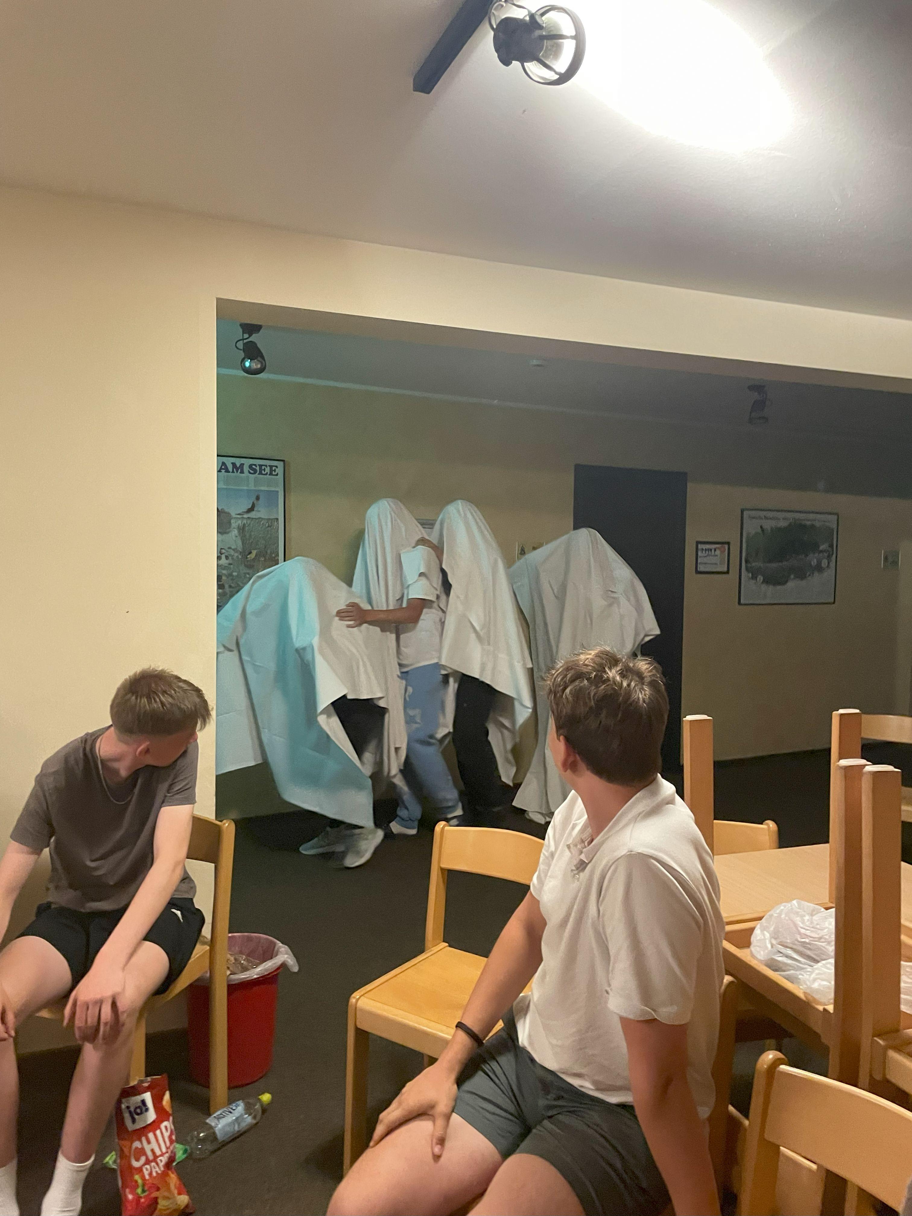 Den Samstag begannen wir mit einem ausgiebigen Frühstück. Anschließend hatten die Jugendbetreuenden verschiedene Stationsspiele vorbereitet, die die Geschicklichkeit und Teamfähigkeit der Jugendlichen testeten. An einer Station musste man beispielsweise einen Turm aus ungekochten Spaghetti bauen, zum Befestigen gab es jeweils einen Meter Schnur und Klebeband. Zusätzlich musste auf den Turm ein Marshmallow gelegt werden, ohne dass der Turm einstürzt oder das Marshmallow herunterfällt. Zu einem anderen Spiel gehörte eine Decke, auf die sich alle Teilnehmenden stellen mussten und diese umdrehen mussten, ohne dass jemand den Boden berührt.