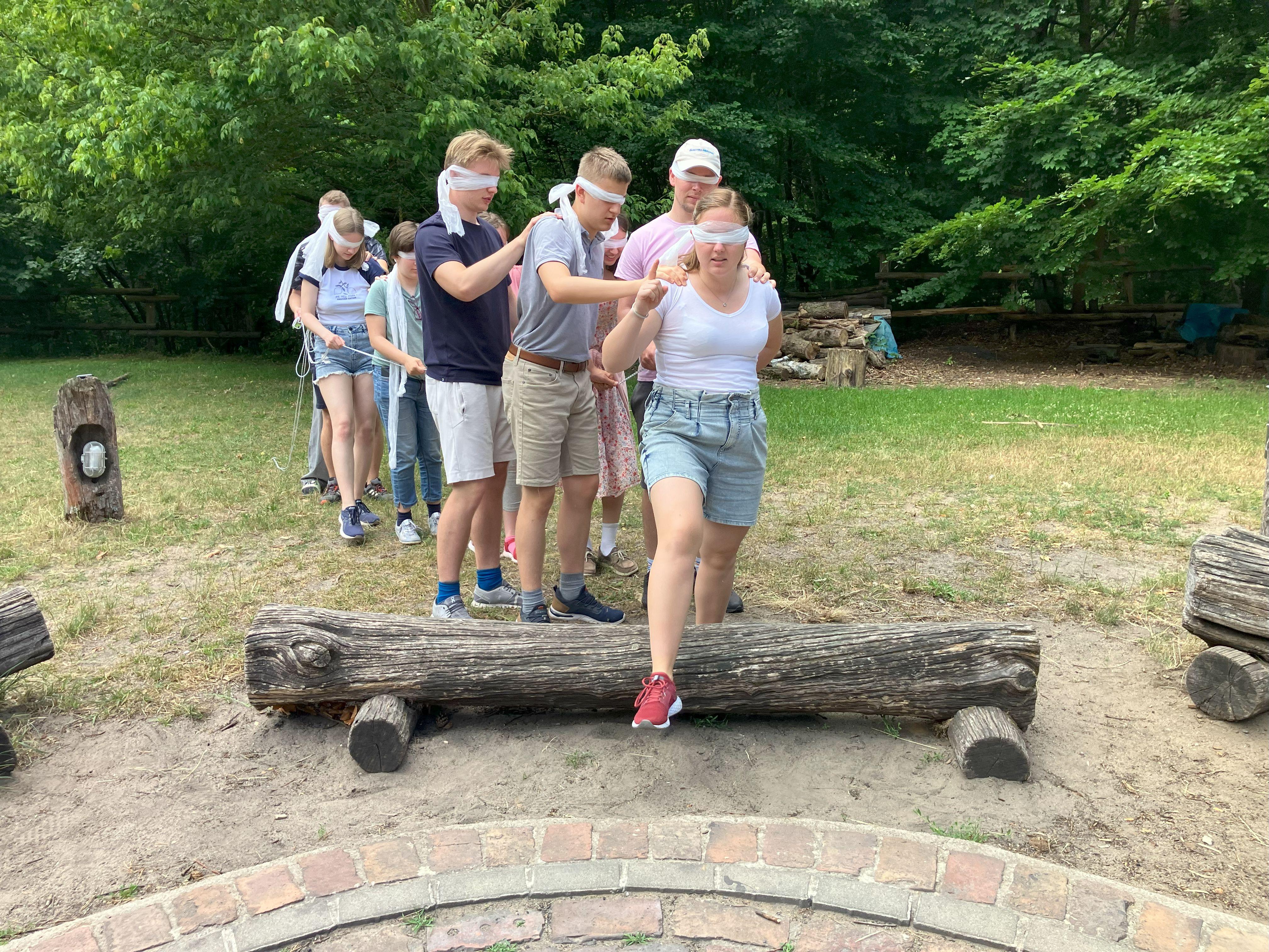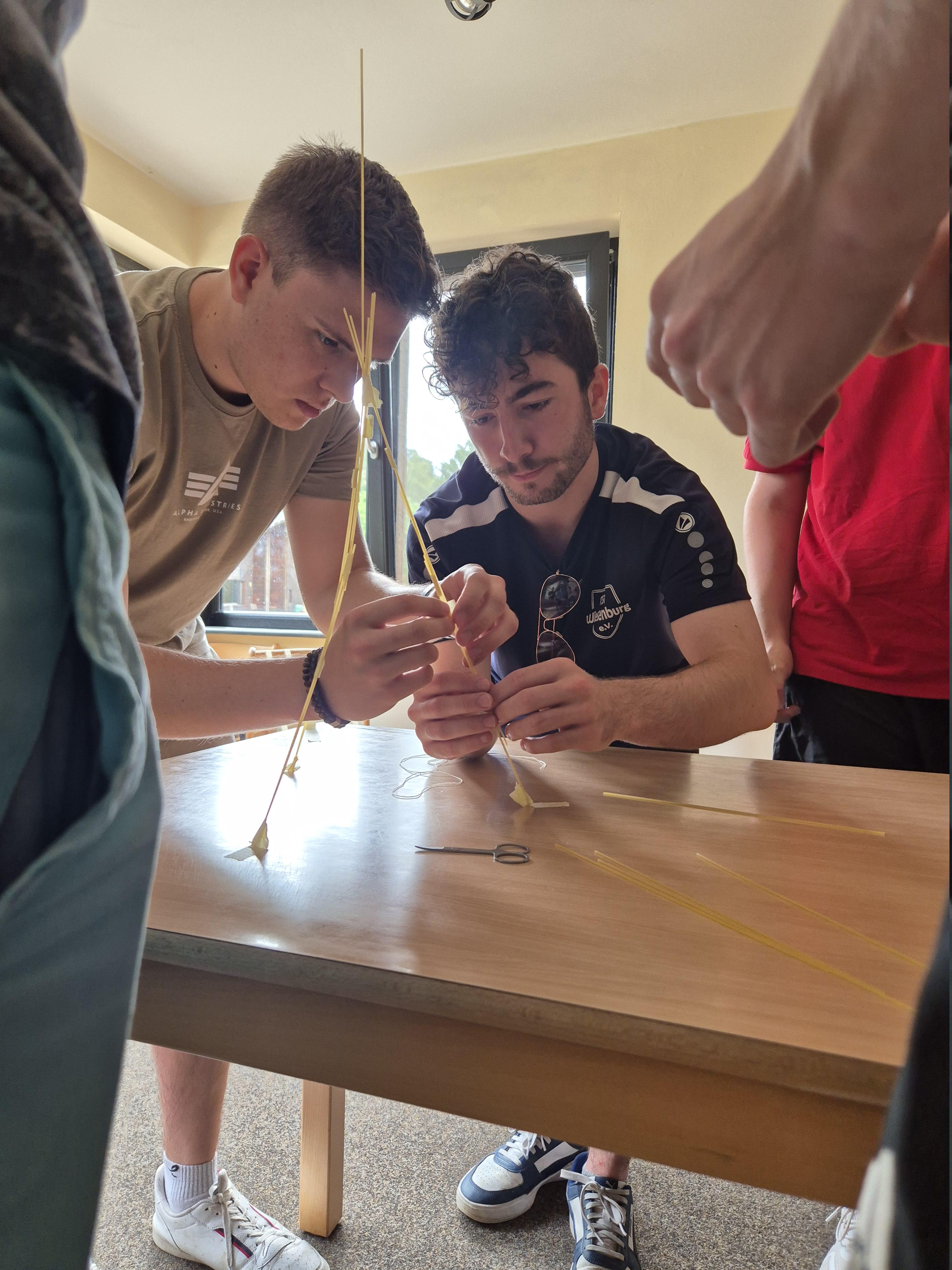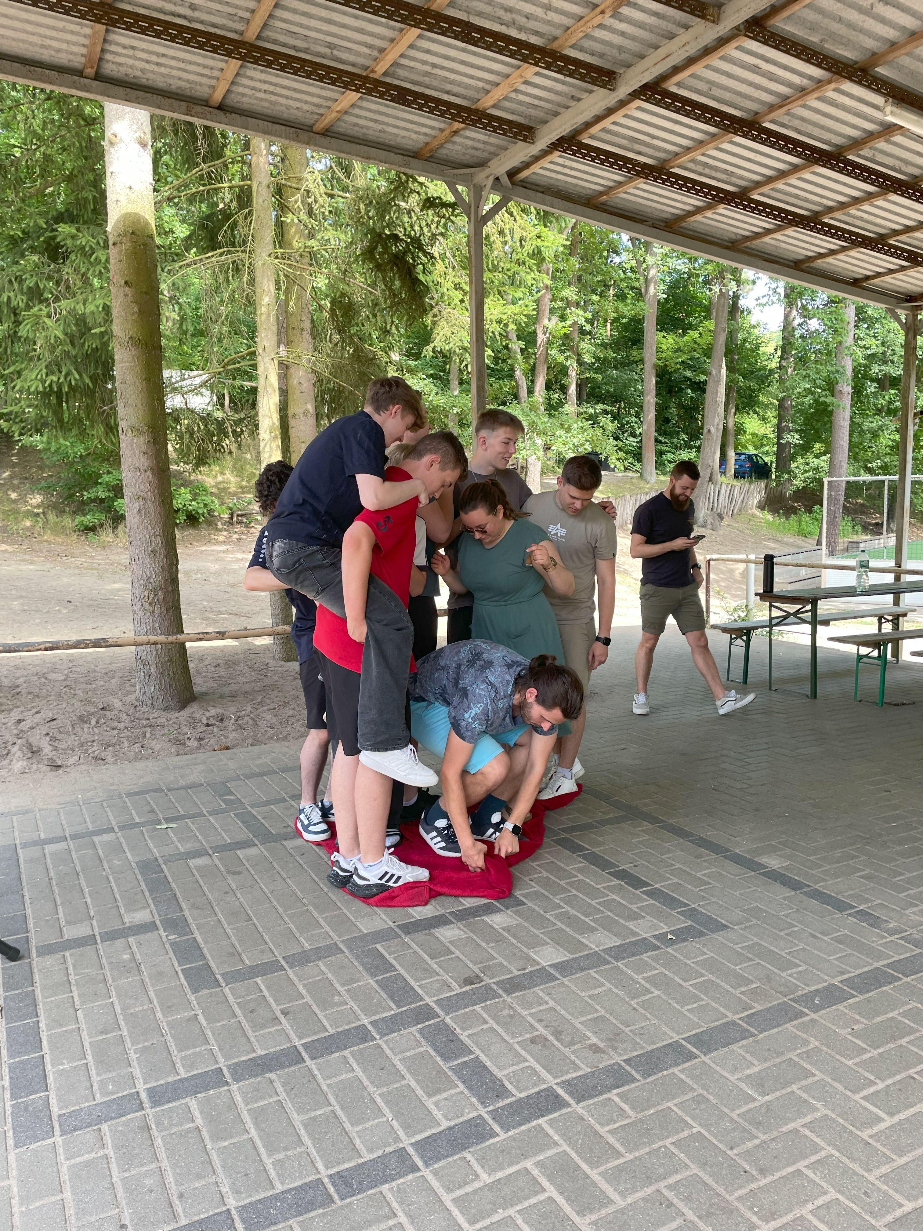 Den Samstag begannen wir mit einem ausgiebigen Frühstück. Anschließend hatten die Jugendbetreuenden verschiedene Stationsspiele vorbereitet, die die Geschicklichkeit und Teamfähigkeit der Jugendlichen testeten. An einer Station musste man beispielsweise einen Turm aus ungekochten Spaghetti bauen, zum Befestigen gab es jeweils einen Meter Schnur und Klebeband. Zusätzlich musste auf den Turm ein Marshmallow gelegt werden, ohne dass der Turm einstürzt oder das Marshmallow herunterfällt. Zu einem anderen Spiel gehörte eine Decke, auf die sich alle Teilnehmenden stellen mussten und diese umdrehen mussten, ohne dass jemand den Boden berührt.